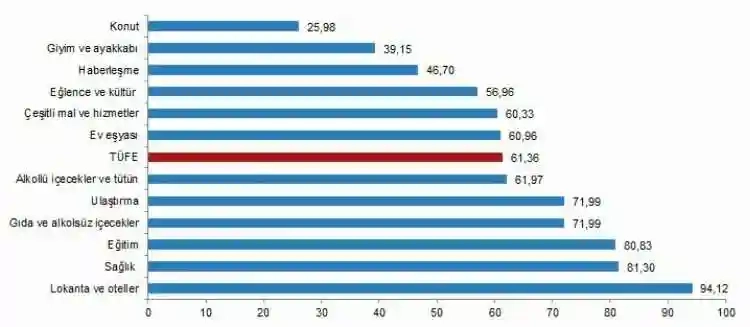 Bir önceki yılın aynı ayına göre en az artış gösteren ana grup yüzde 25,98 ile konut oldu. Buna karşılık, bir önceki yılın aynı ayına göre artışın en yüksek olduğu ana grup ise yüzde 94,12 ile lokanta ve oteller oldu.