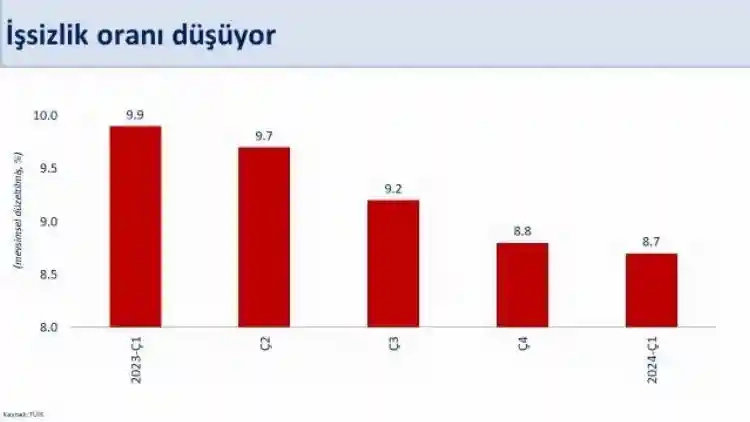 Bakan Şimşek, "İlk çeyrekte geçen yılın aynı dönemine göre 1 milyon 46 bin kişi ilave istihdam sağlandı. Mevsimsel düzeltilmiş işsizlik oranı son 44 çeyreğin en düşük seviyesi olan yüzde 8,7'ye geriledi. Yılın ikinci çeyreğine ilişkin göstergeler ekonomideki dengelenmenin devam ettiğine işaret ediyor. 2024 yılı genelinde net dış talebin pozitif katkı verdiği dengeli bir büyüme öngörüyoruz." dedi.