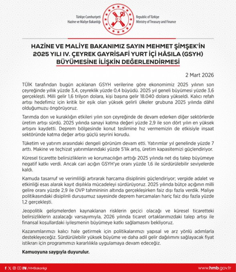 Hazine ve Maliye Bakanı Mehmet Şimşek, 2025 yılı IV. çeyrek Gayrisafi Yurt İçi Hasıla (GSYH) verilerini değerlendirdi. Bakan Şimşek, Türkiye ekonomisinin yılın son çeyreğinde yıllık yüzde 3,4, çeyreklik yüzde 0,4 büyüdüğünü, 2025 yılı geneli büyümesinin ise yüzde 3,6 olarak gerçekleştiğini açıkladı.