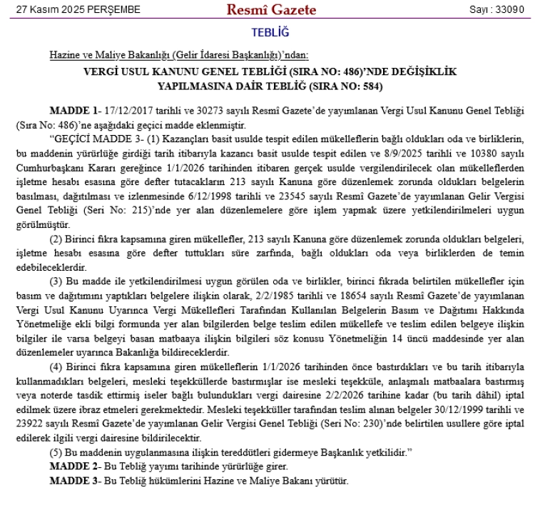 Bugünkü Resmi Gazete’de yayımlanan tebliğ değişikliğiyle, 1 Ocak 2026’dan itibaren gerçek usulde vergilendirilecek basit usul mükelleflerin belge basım ve dağıtım süreçlerinde oda ve birliklere yeni yetkiler tanındı.