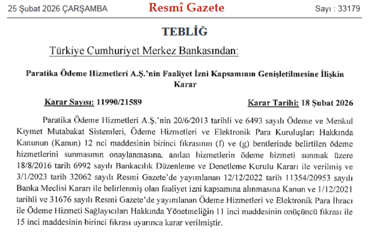 Yeni tebliğ ile Paratika şirketi artık daha geniş ödeme hizmetleri sunabilecek.