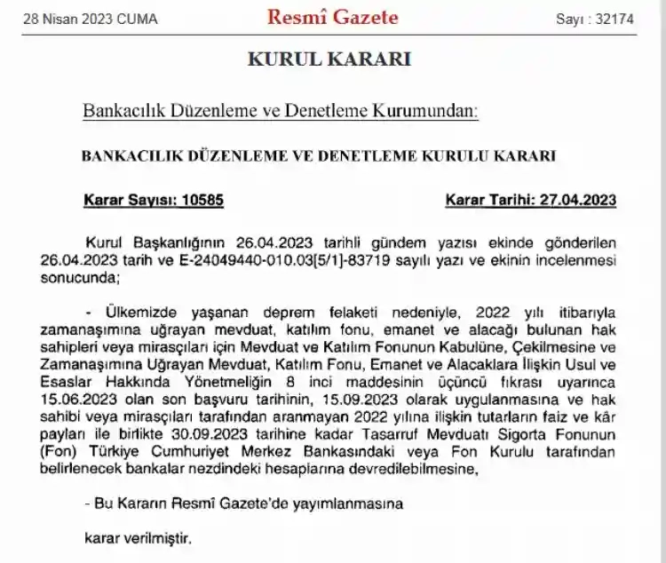 2022 yılı itibarıyla zaman aşımına uğrayan mevduat ve katılım fonu ve alacaklar için 15 Haziran olarak belirlenmiş olan son başvuru tarihini deprem dolayısıyla 15 Eylül’e uzattı.