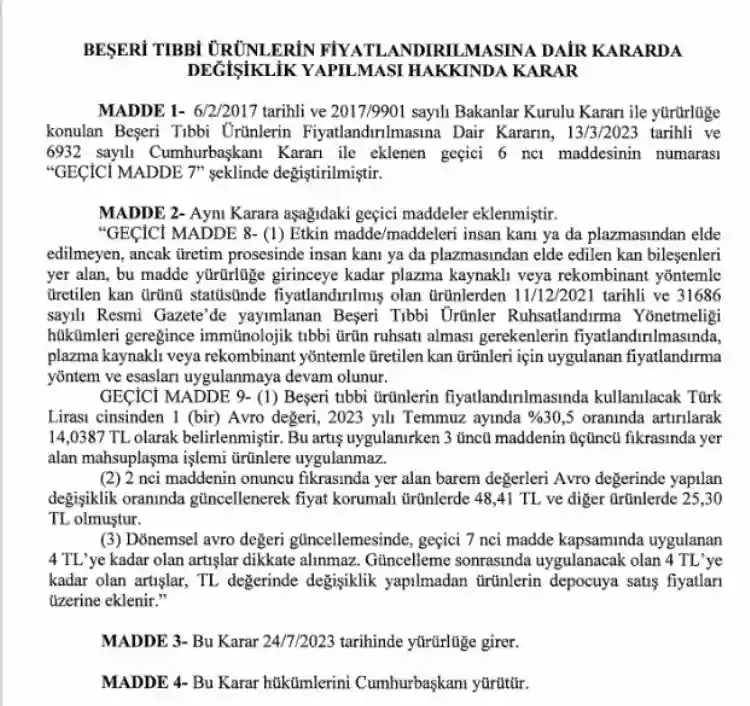 Beşeri Tıbbi Ürünlerin Fiyatlandırılmasına Dair Kararda Değişiklik Yapılması Hakkında Karar, Cumhurbaşkanı Erdoğan'ın imzasıyla bugünkü Resmi Gazete'de yayımlandı.