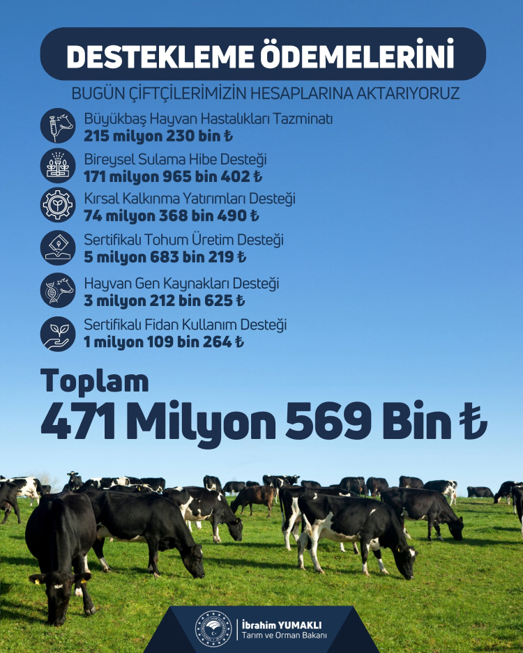 Tarım ve Orman Bakanı İbrahim Yumaklı, toplam 471 milyon 569 bin TL’lik tarımsal destek ödemesinin bugün çiftçilerin hesaplarına aktarılmaya başlandığını duyurdu.