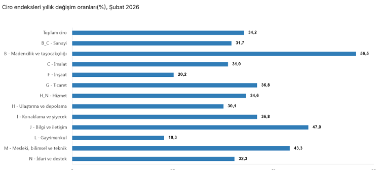 Türkiye İstatistik Kurumu (TÜİK), 2026 yılı Şubat ayına ilişkin ciro endeksi verilerini açıkladı. Buna göre sanayi, inşaat, ticaret ve hizmet sektörlerinin toplamından oluşan ciro endeksi, yıllık bazda yüzde 34,2 artış gösterdi.