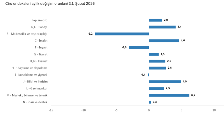Aylık verilere bakıldığında ise toplam ciro endeksi Şubat ayında bir önceki aya göre yüzde 2,0 yükseldi.