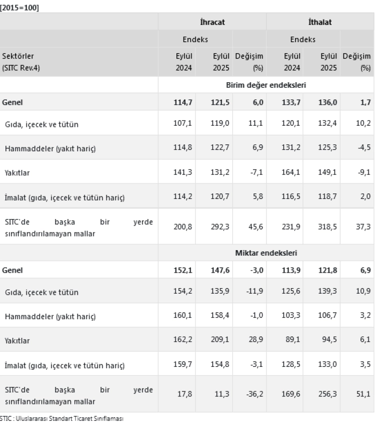 Böylece dış ticaret haddi, 2024 Eylül’deki 85,8 seviyesinden 2025 Eylül’de 89,4’e yükseldi.