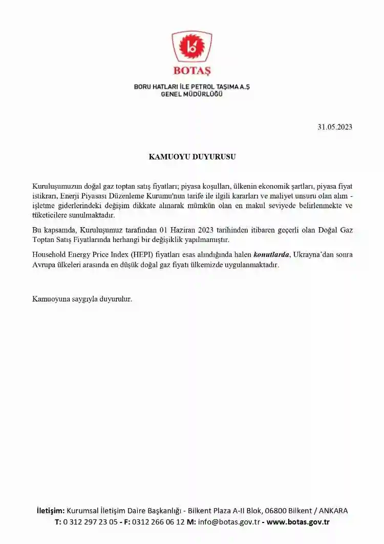 BOTAŞ açıklamasında, "Kuruluşumuzun doğal gaz toptan satış fiyatları; piyasa koşulları, ülkenin ekonomik şartları, piyasa fiyat istikrarı, Enerji Piyasası Düzenleme Kurumu'nun tarife ile ilgili kararları ve maliyet unsuru olan alım - işletme giderlerindeki değişim dikkate alınarak mümkün olan en makul seviyede belirlenmekte ve tüketicilere sunulmaktadır. Bu kapsamda, Kuruluşumuz tarafından 1 Haziran 2023 tarihinden itibaren geçerli olan Doğal Gaz Toptan Satış Fiyatlarında herhangi bir değişiklik yapılmamıştır. Household Energy Price Index (HEPI) fiyatlan esas alındığında halen konutlarda, Ukrayna'dan sonra Avrupa ülkeleri arasında en düşük doğal gaz fiyatı ülkemizde uygulanmaktadır. Kamuoyuna saygıyla duyurulur" ifadeleri yer aldı.