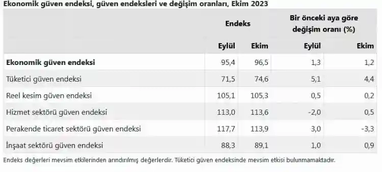 Bir önceki aya göre Ekim ayında tüketici güven endeksi yüzde 4,4 oranında artarak 74,6 değerini, reel kesim (imalat sanayi) güven endeksi yüzde 0,2 oranında artarak 105,3 değerini, hizmet sektörü güven endeksi yüzde 0,5 oranında artarak 113,6 değerini, perakende ticaret sektörü güven endeksi yüzde 3,3 oranında azalarak 113,9 değerini, inşaat sektörü güven endeksi yüzde 0,9 oranında artarak 89,1 değerini aldı.