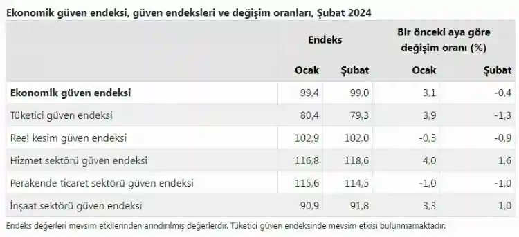 Türkiye İstatistik Kurumu verilerine göre Ekonomik Güven Endeksi Ocak ayında 99,4 iken, Şubat ayında yüzde 0,4 oranında azalarak 99,0 değerini aldı.