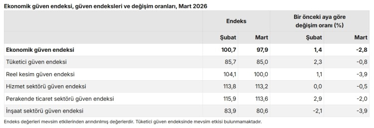 Ekonomik güven endeksi Şubat ayında 100,7 iken, Mart ayında yüzde 2,8 oranında azalarak 97,9 değerini aldı.