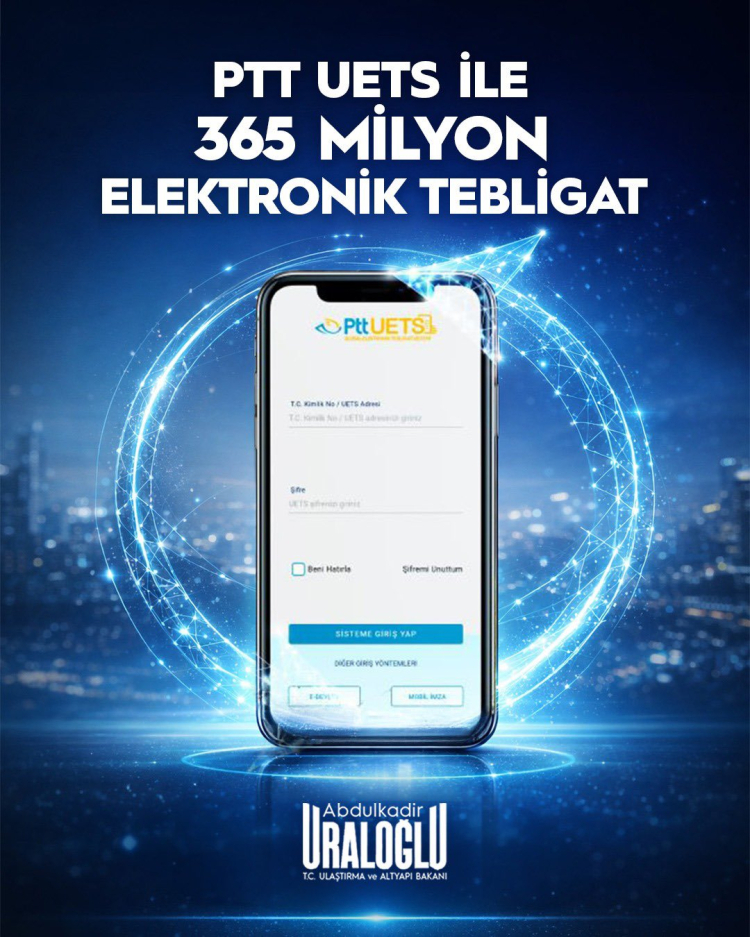 Ulaştırma ve Altyapı Bakanı Abdulkadir Uraloğlu, PTT’nin Ulusal Elektronik Tebligat Sistemi (UETS) ile hem vatandaşlara hem de kamu kurumlarına tebligat gönderimini hızlı ve güvenli hale getirdiklerini duyurdu. Bakan Uraloğlu, sistemin yedi yılda toplam 365 milyon elektronik tebligata ulaştığını belirterek, “Bu dijital dönüşümle 220 bin ağacı koruduk ve yaklaşık 34 milyar TL kamu tasarrufu sağladık” ifadelerini kullandı.