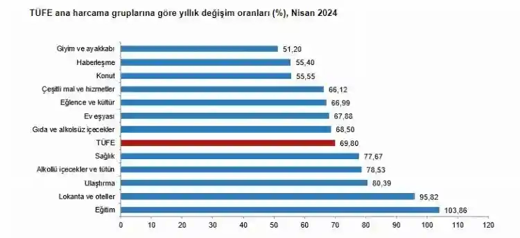 Buna göre, TÜFE'deki değişim 12 aylık ortalamalara göre yüzde 59,64 olarak gerçekleşti. Bir önceki yılın aynı ayına göre en az artış gösteren ana grup yüzde 51,20 ile giyim ve ayakkabı oldu. Buna karşılık, bir önceki yılın aynı ayına göre artışın en yüksek olduğu ana grup ise yüzde 103,86 ile eğitim oldu.
