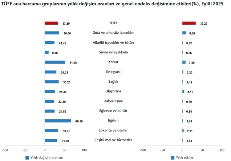 Eylül 2025'te TÜFE yıllık yüzde 33,29, aylık yüzde 3,23 arttı. Gıda ve alkolsüz içeceklerde yıllık yüzde 36,06, aylık yüzde 4,62 artış görülürken, enflasyon verileri, ulaştırmada yıllık yüzde 25,30 ve konutta ise yüzde 51,36 artış gösterdi. ENAG verilerine göre Eylül'deki yıllık artış yüzde 63,23 oldu.