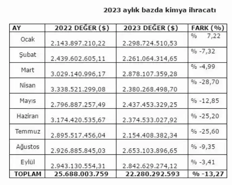 Türkiye İhracatçılar Meclisi (TİM) verilerine göre, Türkiye’nin ihracatı eylül ayında geçen yıl aynı döneme göre yüzde 0,3 artışla 22,7 milyar dolar olarak gerçekleşti. 2,84 milyar dolarlık ihracat gerçekleştiren kimya sektörü ise Eylül ayının ihracat şampiyonu oldu.