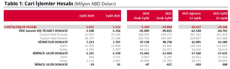 Merkez Bankası verilerine göre, Eylül 2025’te Türkiye’nin cari işlemler hesabı 1,1 milyar ABD doları fazla kaydetti. Altın ve enerji hariç cari fazla ise 6,8 milyar dolar oldu.
