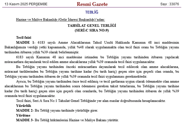 Aynı sayıda yayımlanan Tahsilat Genel Tebliği (Seri: C, Sıra No: 9) ile de, söz konusu kanunun 48’inci maddesi kapsamında uygulanan tecil faizi oranı yıllık yüzde 48’den yüzde 39’a düşürüldü.
