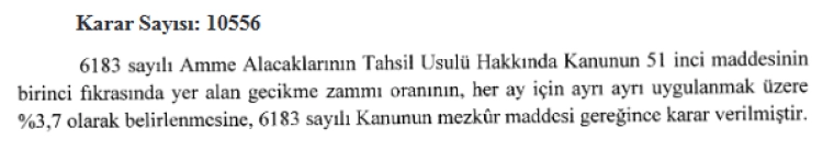 Resmi Gazete’nin bugünkü sayısında yer alan Cumhurbaşkanı Kararı ile, 6183 sayılı Amme Alacaklarının Tahsil Usulü Hakkında Kanun’un 51’inci maddesi kapsamında uygulanan gecikme zammı oranı, her ay için ayrı ayrı uygulanmak üzere yüzde 3,7 olarak belirlendi.
