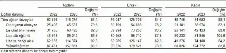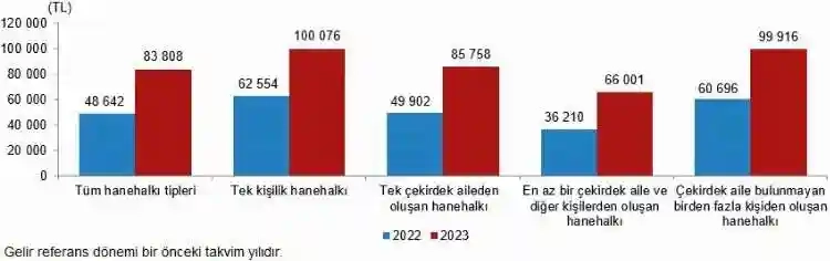 Türkiye'de yıllık ortalama hanehalkı kullanılabilir geliri 2023 yılı anket sonuçlarına göre yüzde 70,7 artarak 167 bin 983 TL oldu. Toplam gelirden en yüksek payı yüzde 48,5 ile maaş ve ücret geliri aldı.