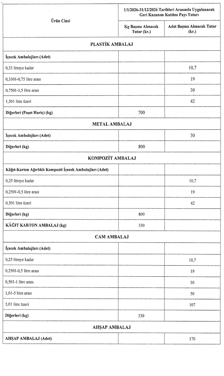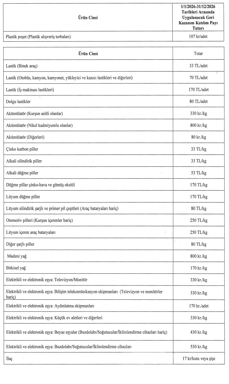 Çevre, Şehircilik ve İklim Değişikliği Bakanlığı’nca hazırlanan ve bugünkü Resmi Gazete’de yayımlanan tebliğle, 2872 sayılı Çevre Kanunu kapsamında alınacak geri kazanım katılım payı tutarları 2026 yılı için güncellendi.