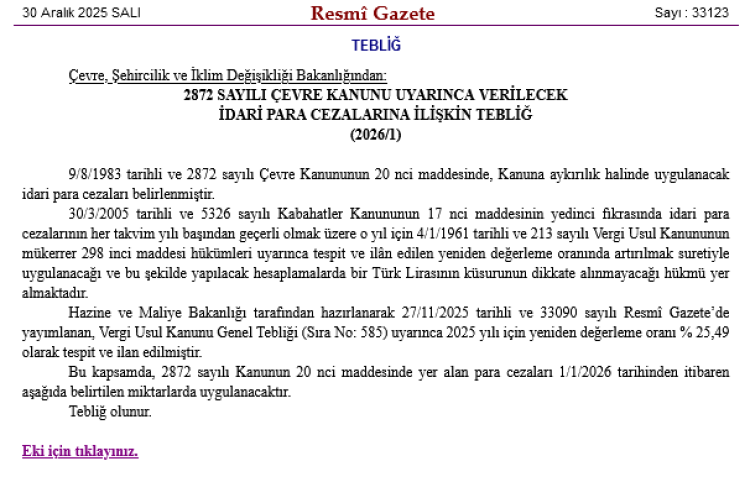 Düzenleme, Çevre Kanunu’nun ek 11’inci maddesi uyarınca her yıl uygulanan yeniden değerleme oranı esas alınarak yapıldı. Hazine ve Maliye Bakanlığı tarafından yayımlanan Vergi Usul Kanunu Genel Tebliği’ne göre 2025 yılı yeniden değerleme oranı yüzde 25,49 olarak tespit edildi.