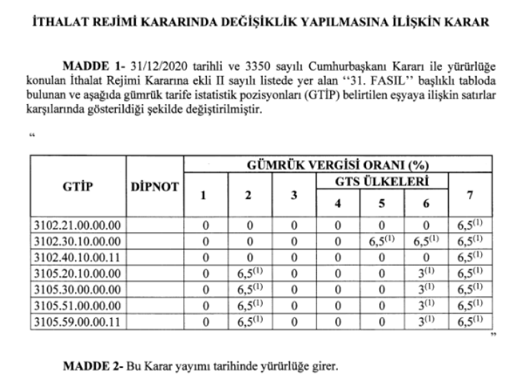 Bugünkü Resmi Gazete'de yayımlanan kararın, küresel gerilimlerin tarımsal girdiler üzerindeki maliyet baskısını artırması üzerine alındığı belirtildi.