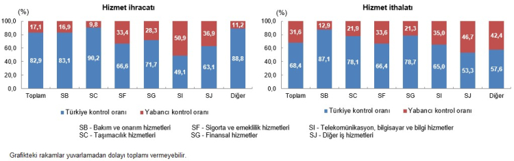 Hizmet ihracatının yüzde 17,1’i, ithalatının ise yüzde 31,6’sı yabancı kontrollü girişimler tarafından yapıldı. Taşımacılıkta ihracatın yüzde 90,2’si, ithalatın yüzde 78,1’i Türkiye kontrollü girişimlerin elinde. Telekomünikasyon, bilgisayar ve bilgi hizmetlerinde ise yabancı kontrollü girişimler ihracatta yüzde 50,9 pay ile öne çıktı.