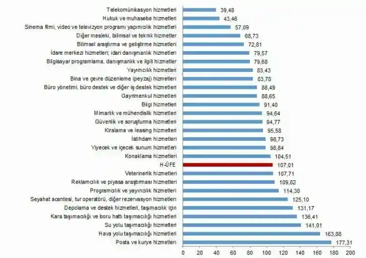 H-ÜFE sektörlerinden telekomünikasyon hizmetleri yüzde 39,48, hukuk ve muhasebe hizmetleri yüzde 43,46, sinema filmi, video ve televizyon programı yapımcılık hizmetleri, ses kaydı ve müzik yayımlama yüzde 57,09 ile endekslerin en az arttığı alt sektörler oldu. Buna karşılık posta ve kurye hizmetleri yüzde 177,31, hava yolu taşımacılığı hizmetleri yüzde 163,88, su yolu taşımacılığı hizmetleri yüzde 141,01 ile endekslerin en fazla arttığı alt sektörler oldu.