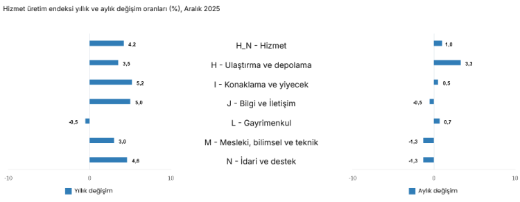 Türkiye İstatistik Kurumu (TÜİK) tarafından açıklanan hizmet üretim endeksi verilerine göre, 2025 yılı Aralık ayında hizmet sektörü üretimi bir önceki yılın aynı ayına kıyasla yüzde 4,2 artış gösterdi.