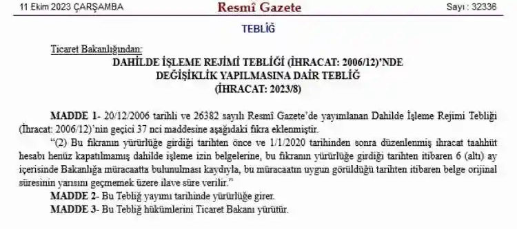 11 Ekim 2023 tarihli Resmî Gazete’de yer alan Dahilde İşleme Rejimi Tebliği'nde Değişiklik Yapılmasına Dair Tebliğle; 1 Ocak 2020 ile 11 Ekim 2023 arasında düzenlenmiş, ihracat taahhüt hesabı henüz kapatılmamış dahilde işleme izin belgelerine, 6 ay içinde Ticaret Bakanlığı'na müracaatta bulunulması şartıyla başvurunun uygun görüldüğü tarihten itibaren belge orijinal süresinin yarısını geçmemek üzere ek süre verilecek.