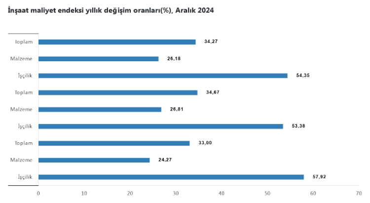 İnşaat maliyet endeksi, 2024 yılı Aralık ayında bir önceki aya göre yüzde 0,70 arttı, bir önceki yılın aynı ayına göre yüzde 34,27 arttı. Bir önceki aya göre malzeme endeksi yüzde 0,41 arttı, işçilik endeksi yüzde 1,29 arttı. Ayrıca bir önceki yılın aynı ayına göre malzeme endeksi yüzde 26,18 arttı, işçilik endeksi yüzde 54,35 arttı.