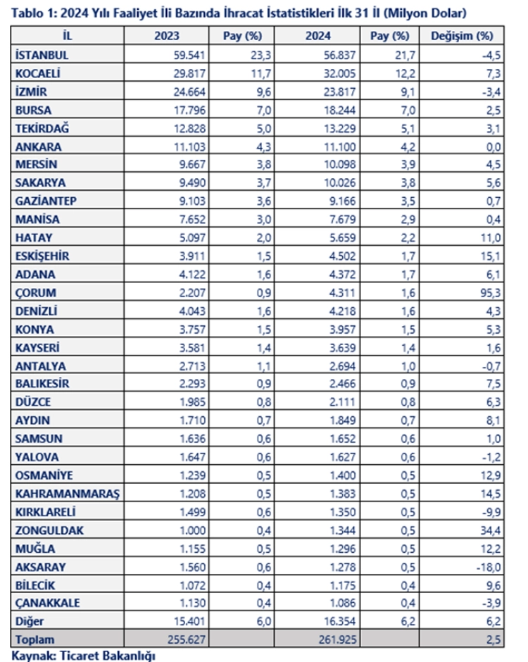 Ticaret Bakanlığı'nın resmi internet sitesinde yaptığı açıklamada, 2024 yılı başından itibaren il bazında ihracat verileri Ticaret Bakanlığı ve TÜİK ortak çalışması olarak, firmaların faaliyet gösterdiği illeri de esas alınarak oluşturulduğunu belirterek ''2024 yılında mal ihracatımız yüzde 2,5 oranında artış ile 262 milyara yükseldi ve Cumhuriyet tarihimizin rekoru kırılmış oldu. Bu ihracat değerindeki payı bakımından 56 milyar 837 milyon dolar ile İstanbul birinci sırayı alırken, Kocaeli 32 milyar 5 milyon dolar ile ikinci sırayı, İzmir 23 milyar 817 milyon dolar ile üçüncü sırayı aldı.'' denildi.