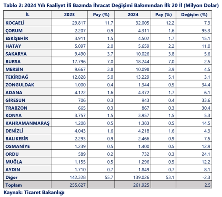 2024 yılında ihracatta en fazla artış yaşanan ilin Kocaeli olduğu aktarılan açıklamada, "Kocaeli 2 milyar 188 milyon dolarlık artışla birinci il, Çorum 2 milyar 104 milyon dolarlık artışla ikinci il, Eskişehir 591 milyon dolarlık artışla üçüncü il oldu. 2024 Aralık ayında geçen yılın aynı ayına göre ; İstanbul yüzde 0,9 artış ve 4 milyar 908 milyon dolarla birinci, Kocaeli yüzde 6,4 artış ve 3 milyar 23 milyon dolarla ikinci sırada yer aldı. İzmir yüzde 8,7 azalış ve 2 milyar 135 milyon dolarla üçüncü sırada, Bursa yüzde 2,5 artış ve 1 milyar 625 milyon dolarla dördüncü sırada, Ankara ise yüzde 10,1 artış ve 1 milyar 144 milyon dolarla beşinci sırada yer alıyor.