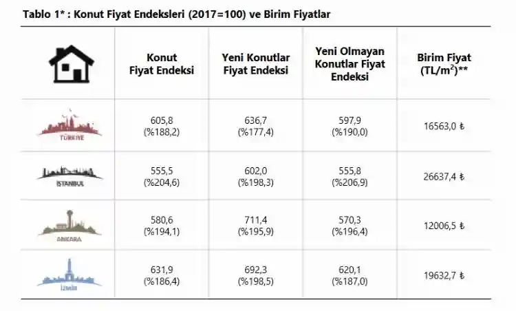 Endeks değerleri bir önceki yılın aynı ayına göre, İstanbul, Ankara ve İzmir’de sırasıyla yüzde 204,6, 194,1 ve 186,4 oranlarında ise artış gösterdi.