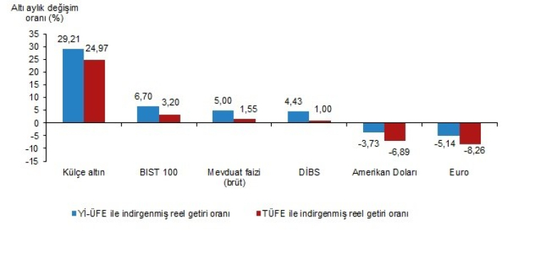 Altı aylık verilerde de lider değişmedi. Külçe altın, Yİ-ÜFE ile yüzde 29,21, TÜFE ile yüzde 24,97 oranında reel getiri sağlayarak zirvede yer aldı. Euro ise bu dönemde de yatırımcısına en çok kaybettiren araç oldu.