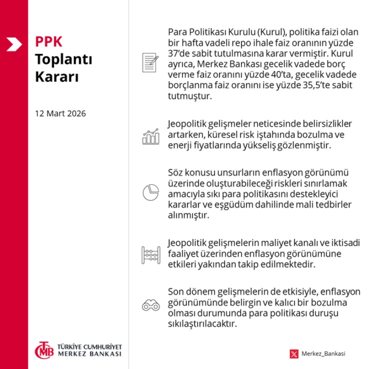 Merkez Bankası Para Politikası Kurulu, bir hafta vadeli repo ihale faiz oranını yüzde 37’de sabit tutma kararı aldı. Kurul, gecelik borç verme faizini yüzde 40, gecelik borçlanma faizini ise yüzde 35,5’te sabit tuttu.