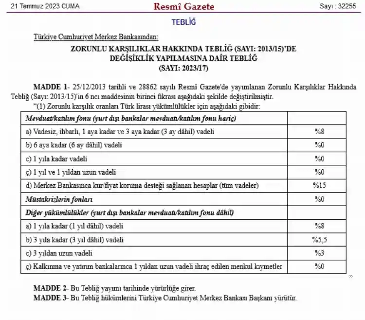 Tebliğe göre, Kur Korumalı Mevduatların zorunlu karşılık oranları artırıldı. Böylece Merkez Bankası, piyasada oluşan Türk Lirası likidite fazlasının, Türk Lirası zorunlu karşılık oran artışıyla sistemden çekilmesini sağlayacak. Bu kapsamda, vadeli Türk lirası mevduata geçişi teşvik eden bir adım olarak, kur korumalı hesaplara yüzde 15 oranında zorunlu karşılık tesis etme yükümlülüğü getirildi.