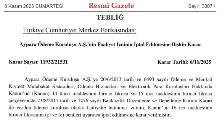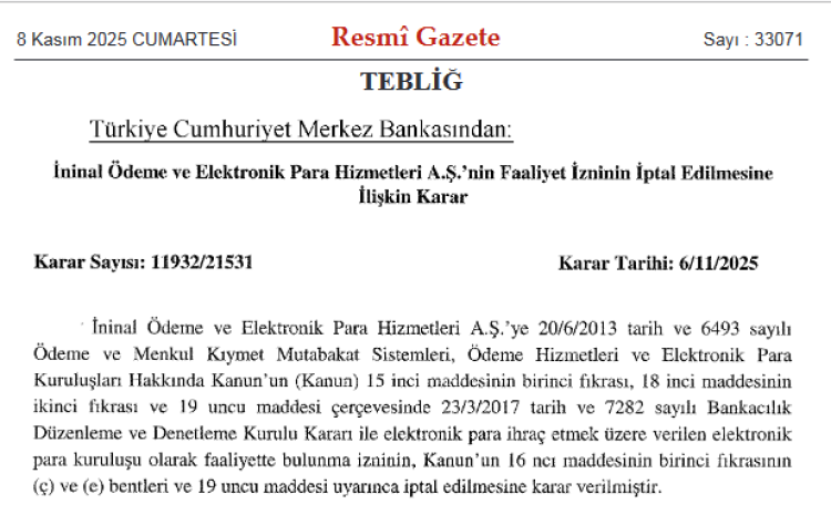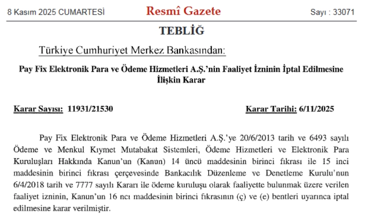 Pay Fix Elektronik Para ve Ödeme Hizmetleri A.Ş., İninal Ödeme ve Elektronik Para Hizmetleri A.Ş. ve Aypara Ödeme Kuruluşu A.Ş.'nin izinleri, 6 Kasım 2025 tarihli 11932/21530 ve 11932/21531 sayılı kararlarla sonlandırıldı.