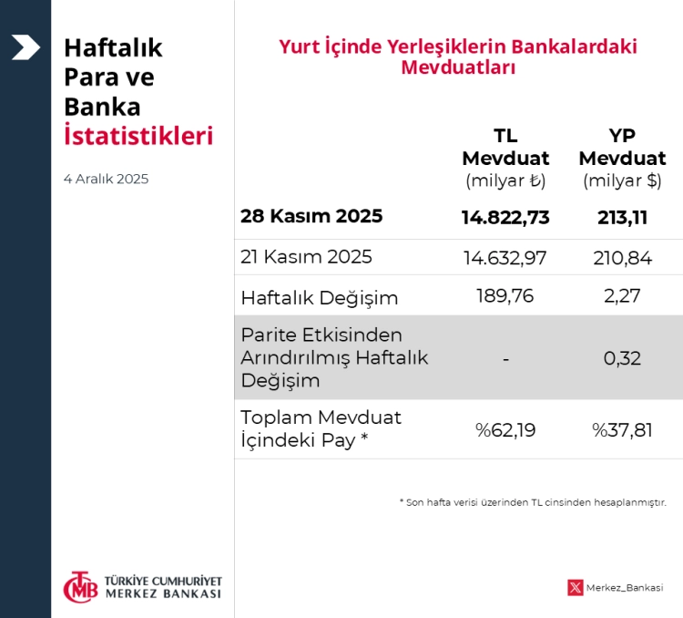 Türkiye Cumhuriyet Merkez Bankası (TCMB), 28 Kasım 2025 haftasına ilişkin para ve banka istatistiklerini yayımladı.