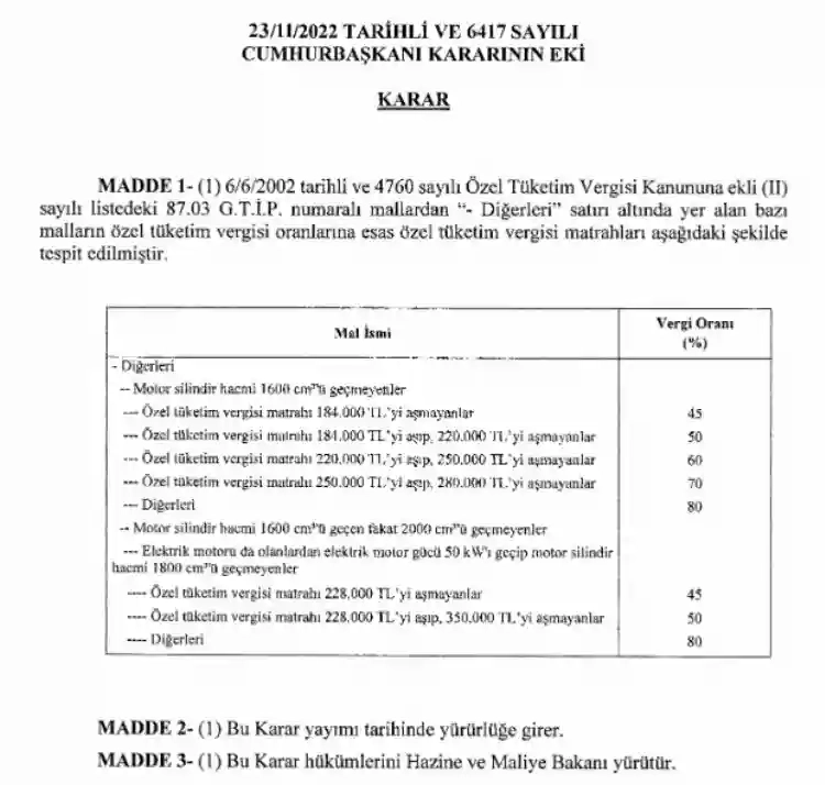 Cumhurbaşkanı Recep Tayyip Erdoğan'ın imzasıyla yapılan düzenlemede, “Özel Tüketim Vergisi Kanununa ekli (II) sayılı listede yer alan bazı malların özel tüketim vergisi oranlarına esas özel tüketim vergisi matrahlarının yeniden tespiti hakkındaki ekli Kararın yürürlüğe konulmasına, mezkûr Kanunun 12’nci maddesi gereğince karar verilmiştir” ifadelerine yer verildi.
