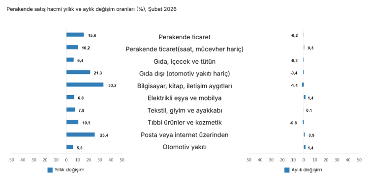 TÜİK verilerine göre ticaret satış hacmi Şubat ayında yıllık yüzde 4 artarken, perakende satışlardaki güçlü yükseliş dikkat çekti. Aylık bazda ise genel endeks geriledi. Yıllık değişimlerde kitap, bilgisayar ve iletişim aygıtları perakende satışların zirvesinde yer aldı.