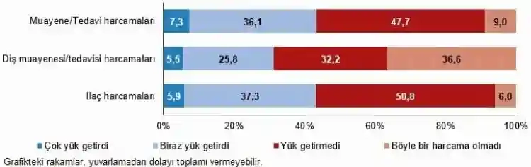 İstatistiki verilere göre hanelerin yüzde 7,3'üne doktor muayene ve tedavi harcamalarının çok yük getirdiği, yüzde 36,1'ine biraz yük getirdiği, yüzde 47,7'sine ise yük getirmeği gözlenirken, diş muayene ve tedavi harcamaları hanelerin yüzde 5,5'ine çok, yüzde 25,8'ine biraz yük getirirken yüzde 32,2'sine yük getirmedi. İlaç harcamaları ise hanelerin yüzde 5,9'una çok, yüzde 37,3'üne biraz yük getirdi. Hanelerin yüzde 50,8'i ilaç harcamalarının yük getirmediğini belirtti.