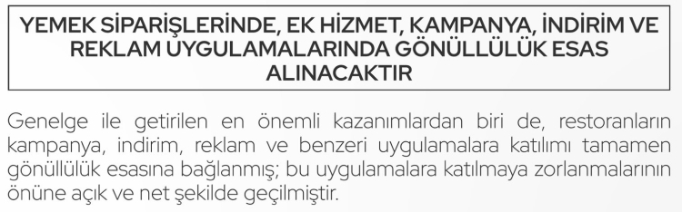 Düzenleme kapsamında ayrıca restoranların kampanya, reklam ve indirim uygulamalarına katılımı tamamen kendi tercihine bırakıldı.