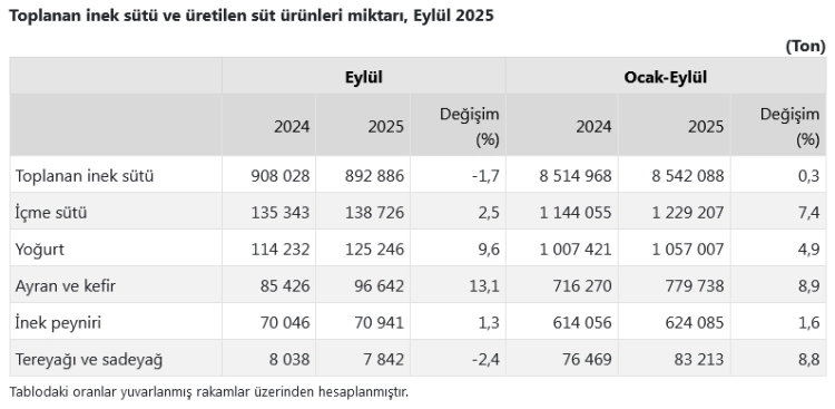 Geçen yılın aynı ayına göre Eylül ayında; inek peyniri üretimi yüzde 1,3, ayran ve kefir üretimi yüzde 13,1, yoğurt üretimi yüzde 9,6 ve içme sütü üretimi yüzde 2,5 artarken, tereyağı ve sadeyağ üretimi ise yüzde 2,4 azaldı.
