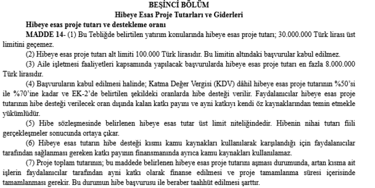 Hibeye esas proje tutarı üst limiti 30 milyon TL, alt limiti 100 bin TL olacak.