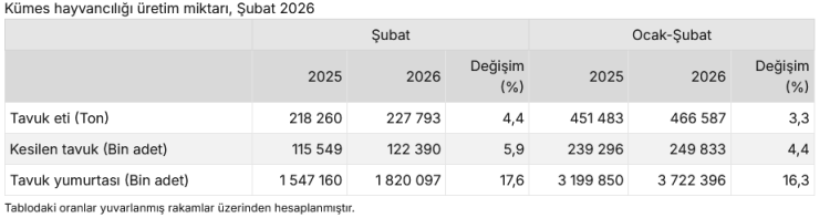 Şubat ayında geçen yılın aynı ayına göre tavuk yumurtası üretimi yüzde 17,6, kesilen tavuk sayısı yüzde 5,9 ve tavuk eti üretimi yüzde 4,4 arttı. Ocak-Şubat döneminde ise yıllık bazda yumurta üretimi yüzde 16,3, kesilen tavuk sayısı yüzde 4,4 ve tavuk eti üretimi yüzde 3,3 artış gösterdi.