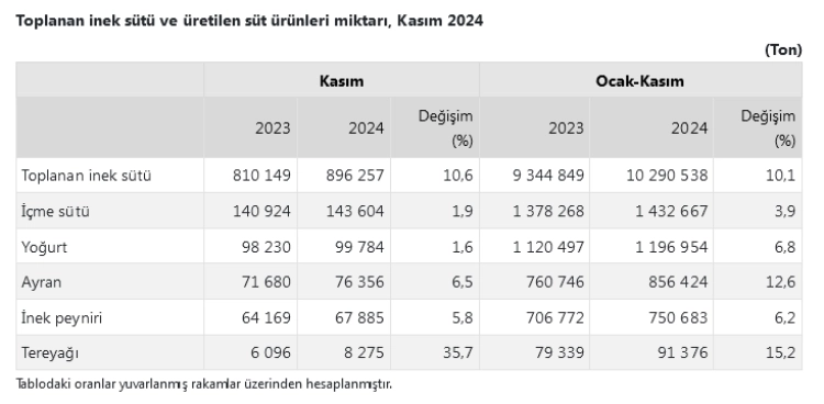 Kasım ayında bir önceki yılın aynı ayına göre, inek peyniri üretimi yüzde 5,8 arttı, ayran üretimi yüzde 6,5 arttı, yoğurt üretimi yüzde 1,6 arttı, içme sütü üretimi yüzde 1,9 arttı, tereyağı üretimi yüzde 35,7 arttı.