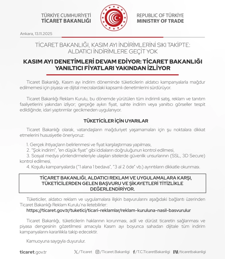 Ticaret Bakanlığı, Kasım ayı indirim döneminde tüketicilerin aldatıcı kampanyalardan etkilenmemesi için hem piyasa hem de dijital mecralarda denetimlerini yoğunlaştırdı.