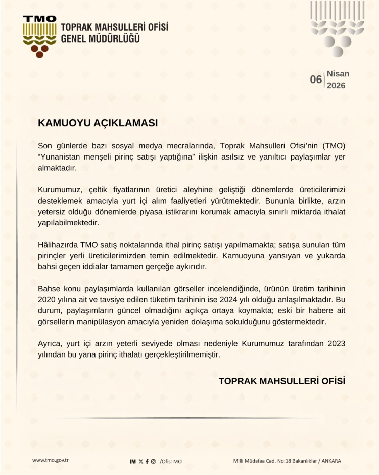 TMO açıklamasında, hâlihazırda TMO satış noktalarında ithal pirinç satışının bulunmadığı ve satışa sunulan tüm pirinçlerin yerli üreticilerden temin edildiği belirtildi.