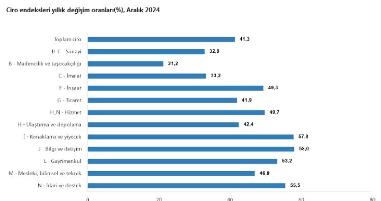 TÜİK, toplam cironun alt detaylarına bakıldığında; 2024 yılı Aralık ayında yıllık sanayi sektörü ciro endeksi yüzde 32,8 arttı, inşaat ciro endeksi yüzde 49,3 arttı, ticaret ciro endeksi yüzde 41,9 arttı, hizmet ciro endeksi yüzde 49,7 arttı.